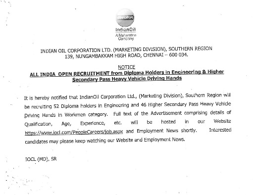 IOCL recruitment 2018: The Indian Oil Corporation Ltd has announced 98 vacancies for Diploma holder and 12th pass candidates at iocl.com. As per the official notification, the company will be hiring 52 diploma holders in engineering and another 46 Higher Secondary Pass Heavy Vehicle Driving Hands in Workmen category. Candidates who are eligible and interested must note that the last date to apply online is January 29, 2018. Indian Oil Corporation Ltd has announced these vacancies in the Southern Region.