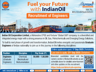 The engineers are required in three different disciplines – Chemical, Electrical and Instrumentation. The advertisement with Advt. No. IOCL/CO-HR/Rectt/2025/01 states that the Maharatna company requires Graduate Engineers to add to its existing work force.