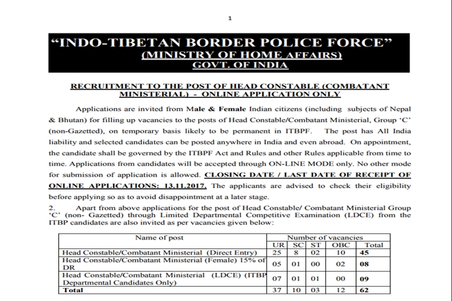 ITBP Recruitment 2017: The Indo-Tibetan Border Police Force has announced 62 vacancies for the post of Group ‘C’ Head Constable at recruitment.itbpolice.nic.in. According to the official notification, both male and female Indian citizens (including subjects of Nepal and Bhutan) can apply for the posts. Candidates who are interested must apply by first visiting the official website. The last date of receiving the online application is 13.11.2017. Total vacancies may vary due to administrative reasons and ITBP reserves the right to make changes in sequence of the recruitment procedure, the official notification read.