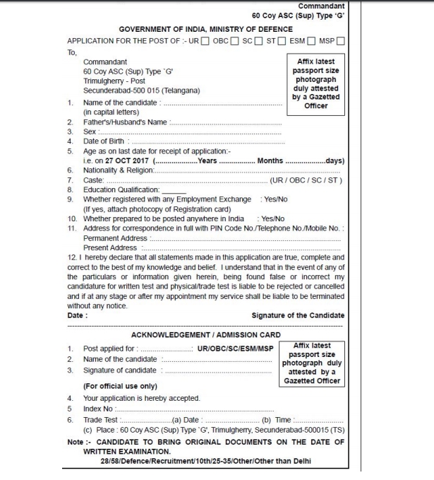 Ministry of Defence recruitment 2017: The 60 Coy ASC (SUP) Type G of the Ministry of Defence, has announced 50 vacancies in various posts. According to the official notification, Civilian Motor Driver, Cook and Fireman etc. vacancies will be filled in this recruitment drive. Candidates who are interested can submit their application through prescribed format on or before 2-11-2017. The application will only be received by post, the notification reads. Candidates must fill the form given in the prescribed format and it should reach the Commandant, 60 Coy ASC (Sup) Type G, Trimulgherry P.O., Secunderabad-500015 (TS) before the last date.