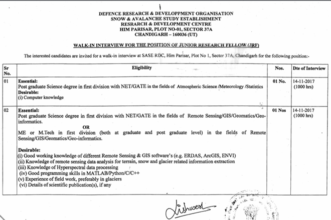 DRDO Recruitment 2017: Ministry of Defence recruitment 2017: The Defence Research and Development Organisation, under the Ministry of Defence, has announced various vacancies. According to the notification, the DRDO will conduct walk-in-interview at SASE RDC, Him Parisar, Plot no 1, Sector 37 A, Chandigarh. A total of 10 vacancies have been announced under various discipline like atmospheric science, Geomatics, and Geophysics etc. Candidate must note that they need to type a written application with complete bio-data. The application must be addressed to Director, Snow and Avalanche Study Establishment (SASE), Research and Development Center (RDC), Him Parisar, Sector 37 A, Chandigarh (UT). At the right top of the application, an Indian Postal stamp amounting to Rs 10 must be affixed with recent passport size photo.