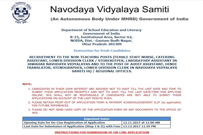 Navodaya Vidyalaya Samiti recruitment 2017: Important instructions for filling up the application form:-