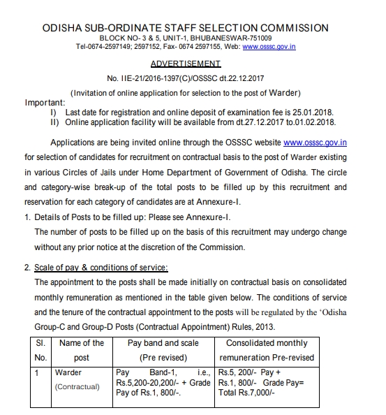 OSSSC job: The Odisha Sub-Ordinate Staff Selection Commission (OSSSC) has announced 238 vacancies for the post of Warder at osssc.gov.in. Candidates who are interested and eligible can apply visiting the official website. Job aspirants must note that the last date to apply through the prescribed format is 25 January 2018. Candidates who have passed the 10+2 Exam conducted by CHSE, Odisha or ICSE or CBSE or any other equivalent examination are eligible to apply for the post. According to the job notification, the age of the candidates who are willing to apply must be between 18-25 years. “Date of birth as recorded in the HSC Certificate issued by the Board of Secondary Education Odisha or equivalent certificate issued by recognized Board/ Council/ Indian University shall only be accepted,” as per the job notification.
