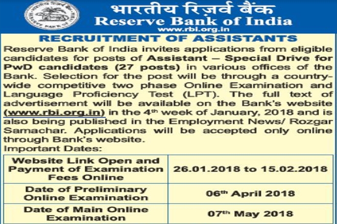 RBI assistant 2018: The Reserve Bank of India has recently announced that they will be hiring candidates for the post of assistant at rbi.org.in. Job aspirants who want to make their career in the banking sector can grab this opportunity. Candidates must note that the application process has begun from January 26, 2018. According to the job notification, the RBI has said that it will hire 27 assistants in its offices across the country. Those who have a graduate degree from a recognised can apply for the posts. This is a special recruitment drive for PWD Candidates, as per the official notification. The last date to apply online is February 5, 2018. Candidates who have successfully filled the application form should start their preparation as the dates for the examination will soon be notified by the RBI.