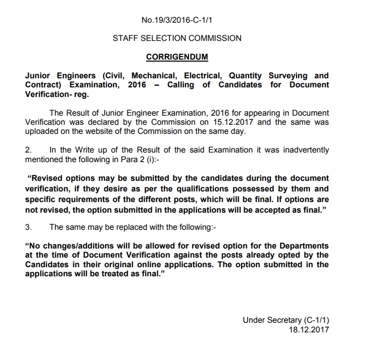 SSC JE 2016 examination: The Staff Selection Commission (SSC) conducts examination for the recruitment junior engineering which lakhs of students appear every year. The examination is conducted to fill posts in civil, mechanical, electrical, quantity surveying and contract posts. The commission had declared SSC JE 2016 examination paper II results on December 15 at ssc.nic.in. Now, the commission has released an important notification regarding SSC JE 2016 examination relating to the “revised options” that was available during the document verification. As per the official notification of the SSC, “No changes/additions will be allowed for a revised option for the Departments at the time of Document Verification against the posts already opted by the candidates in their original online applications. The option submitted in the applications will be treated as final.”