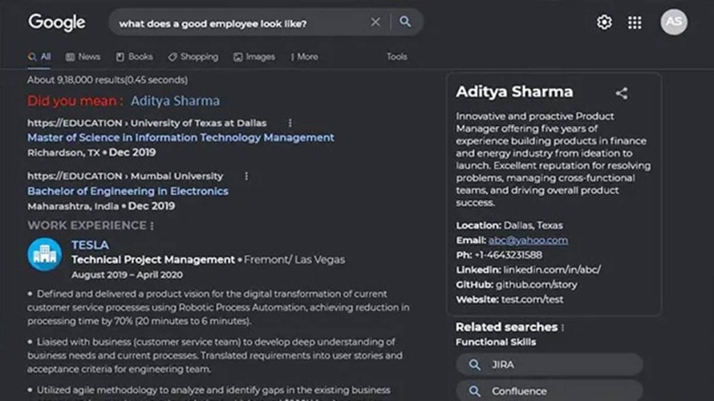 A LinkedIn user Aditya Sharma outlined a resume in a manner that garnered heaps of praise from many on the platform. At HiCounselor, he is the Co-Founder and Chief Executive Officer. The innovative resume looks like the search result page on Google. Education and work experience are the sub-headings. Interestingly, the template also shows search bars and links that display his skills and educational background. It seems that the design is made in Google Chrome’s dark mode.