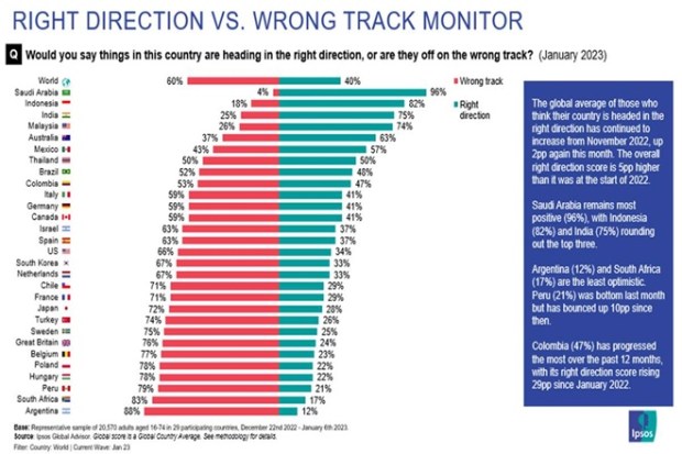 Striking a pessimistic note, as many as 75 per cent people of India are of the opinion that the country is marching on the right track while unemployment is billed to be their biggest cause of concern, a monthly survey report revealed. In contrast, around 60 percent of people have poured out a pessimistic feeling across the world, citing the reason that they believe that their nation is heading in the wrong direction, according to the findings of a global survey carried out by Ipsos What Worries the World for the month of January (2023).