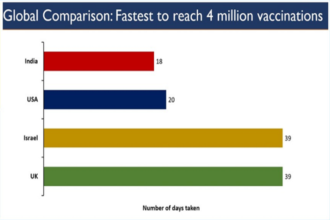 According to the data shared by Vardhan, the United States touched the 4-million mark in 20 days followed by Israel and the UK in 39 days. To be sure, India has vaccinated around 48 per cent of around 92.61 lakh health workers that have been enrolled from the public and private healthcare facilities.