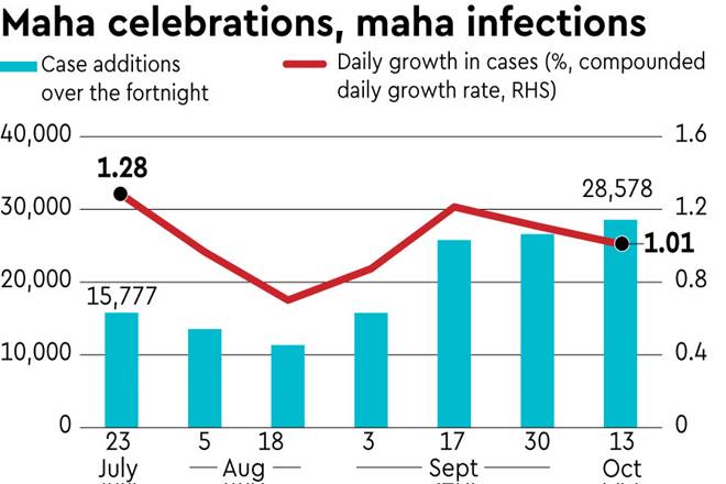 While festivities across the country have been subdued, the government is justified in telling people to maintain social distancing and asking them not assemble in large numbers during the festival season. An FE analysis of infections during Ganesh Chaturthi in Maharashtra and Mumbai shows festivals can be super spreaders.