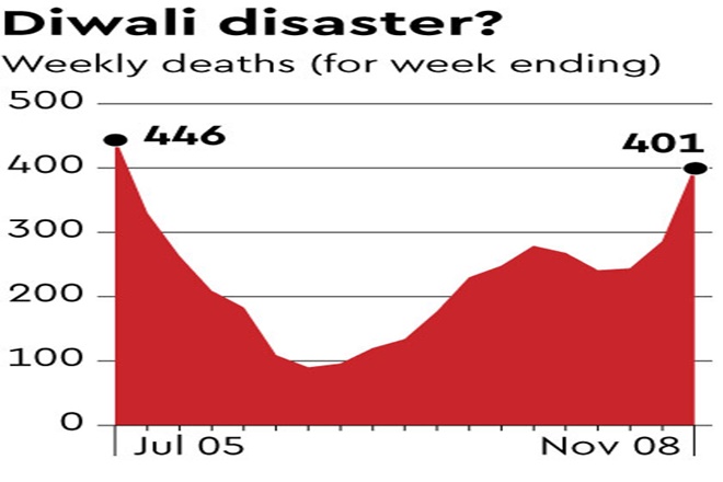 Delhi’s daily infections of 6,000 or more are a matter of concern but it’s the rising number of deaths that’s more worrying. The ratio of deaths in the Capital has increased from 10 per thousand on October 8 to 14 per thousand on November 8. It recorded 401 deaths for the week ending November 8, marking an increase of 40% over the previous week. That’s the highest tally since July.