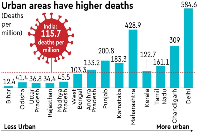 Maharashtra, which has 45% of its population living in urban areas, has registered 429 deaths per million, while Tamil Nadu with a 48% urban population as per the 2011 Census has a death rate of 161 per million.