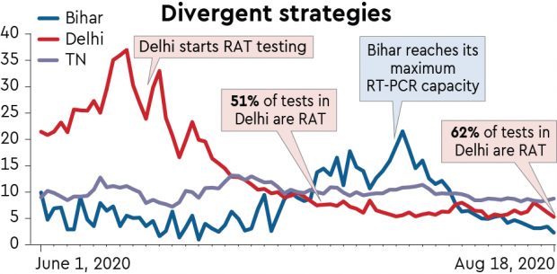 RATs now account for 62% Delhi’s total tests whereas a month ago this ratio was just 52%. When Bihar tested only 10,273 samples a day on July 18, its positivity was 17.8%. On August 18, it tested 1,07,727 samples, and its positivity was just 2.3%.