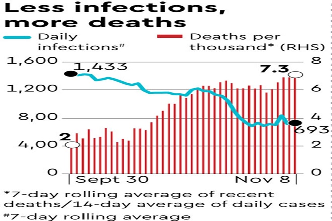 An analysis of the ratio of recent deaths to daily infections shows that there has been a nearly three times increase in the proportion of deaths to cases. While Bihar was recording two deaths per thousand people at the start of October, this ratio has now increased to 7.3 deaths per thousand.