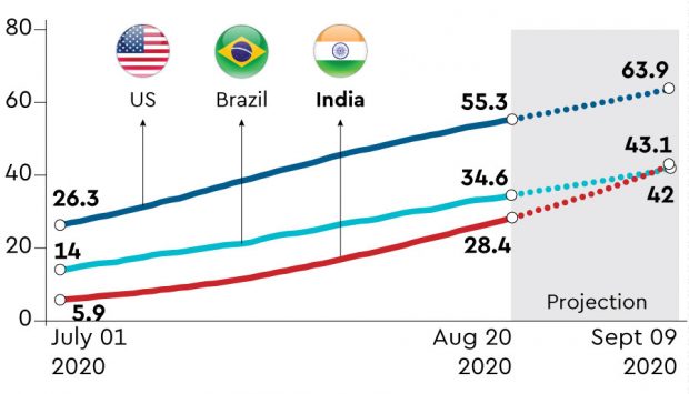 While the US (5.6 million) and Brazil (3.6 million) still have a higher number of infections, the gap is narrowing. Daily cases are still growing at 2.3% in India, compared to 1.1% in Brazil and 0.8% in the US.