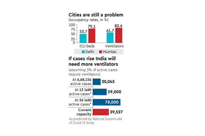 Given that in cities like Delhi, Mumbai or Pune, anywhere between 3 to 5% of the active cases require ventilators, a rise in cases would pressure the infrastructure. In Delhi, for instance, ICU bed occupancy is 54% and ventilator occupancy is 62%. However, the situation is grimmer in Mumbai, where 83% of ventilators and 79% of ICU beds are occupied.