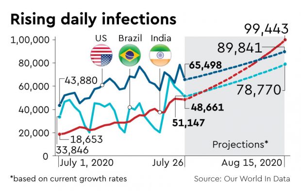 Covid-19 cases in India: India on Monday inched closer to clocking 50,000 infections a day and is on course to beat Brazil at this metric; last week, India added 3.1 lakh cases while Brazil added 3.2 lakh. At this pace, India is also likely to surpass the US within two weeks by which time, it will be adding around 90,000 cases per day while the US will add around 85,000. For several weeks now, India has reported the fastest growth in infections in the world.