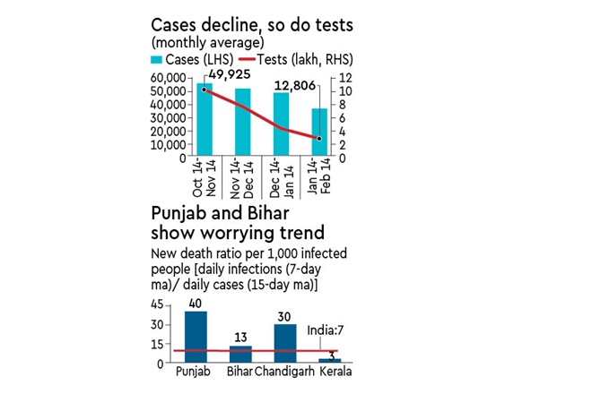 The data from Bihar is more puzzling. The monthly infection average has declined by 62% even as testing has fallen by 26%. While the daily infections in the state averaged 463 in the month to January 14, the average between January 14 and February 14 was only 169. However, the ratio of new deaths in Bihar during this period nearly doubled from 8 per thousand to 13.