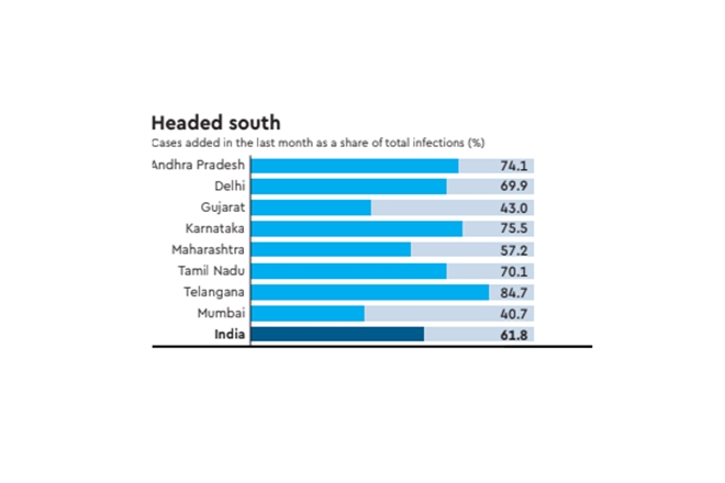 What emerges from this is that, while Delhi and Mumbai used to be the epicentres of Covid-19, this is no longer the case. Cities like Chennai that, a month ago, had 20,000 cases – it accounted for 8.5% of India’s infections at that time – has 70,000 cases right now and accounts for 10% of the country’s cases. Hyderabad accounted for 1% of India’s cases a month ago, but this has jumped to 3%.