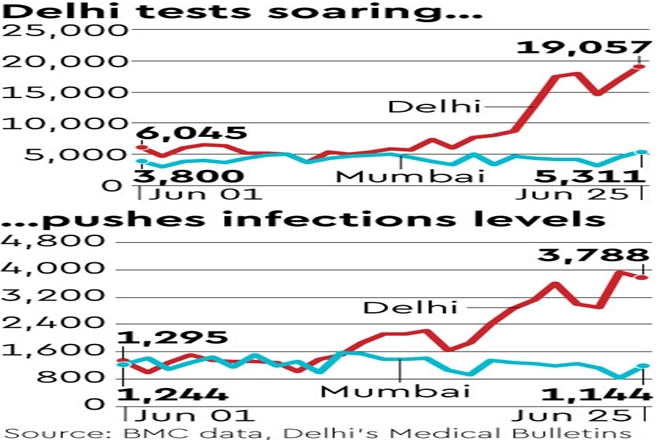 An equally big reason for this, however, was also the fact that while Delhi has ramped up testing levels from 6,045 on June 1 to 17,533 on June 21, Mumbai has been almost stagnant, with the level of daily testing rising from 3,066 to just 4,206 during the same period.
