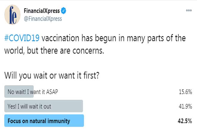 “#COVID19 vaccination has begun in many parts of the world, but there are concerns….Will you wait or want it first?” Financial Express asked its follower on the microblogging site Twitter.