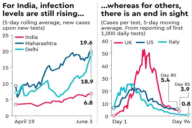 If things are bad in states like Delhi and Maharashtra that account for, respectively, 11% and 20% of India’s infections, they are even worse in some others like Tamil Nadu, which accounts for 12% of infections and where new infections per 100 tests rose from 1 on April 19 to as much as 8.8 on June 3.
