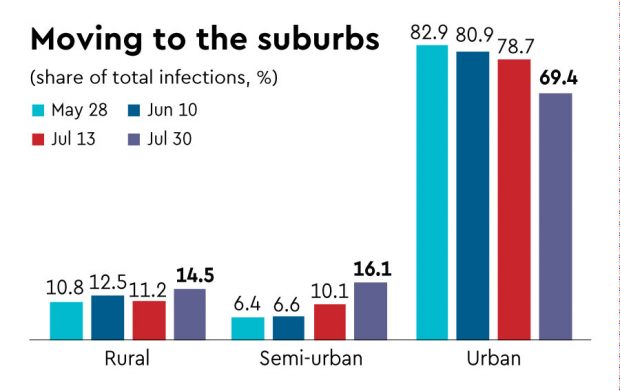 The increase in country’s daily average case counts was 3.5% on July 30 with urban centres clocking a lower 2.7%. In contrast, semi-urban and rural centres reported rises of 6.4% and 5.1%, up from 5% and 3.3% on July 13. If these trends hold, then by August 31, the share of urban centres in total infections would fall to 51%, with semi-urban and rural areas accounting for the rest.