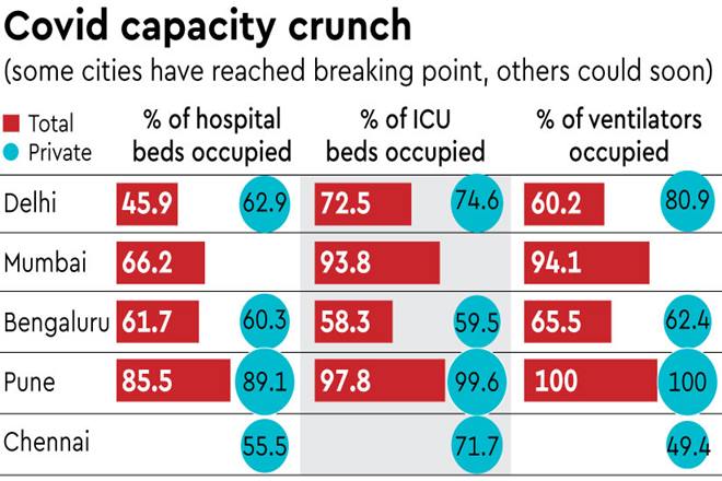 Mumbai seems to be in a comfortable position with a third of hospital beds still unoccupied, but it is operating at around 95% levels when it comes to ICU beds and ventilators. If it does not augment capacity quickly, or if infection levels rise, the city will run out of both ICU and ventilator capacity in another 5-6 days.