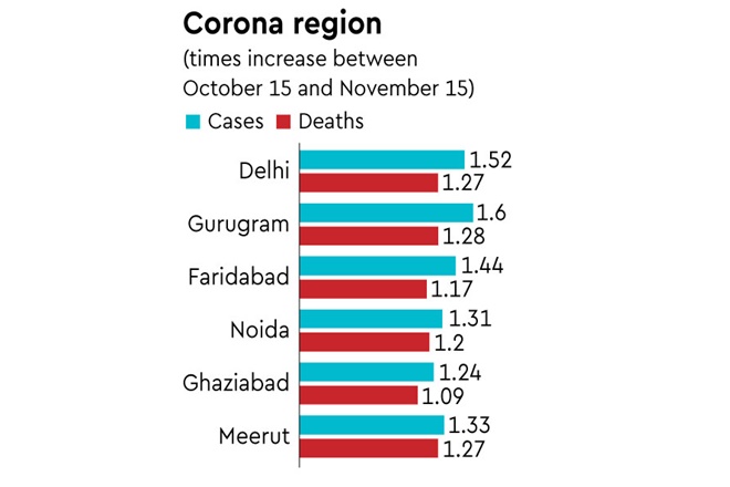 Cases in Faridabad grew a bit lower 1.44 times between October 15 and November 15, but the average positivity was a higher 18%. While deaths in the capital increased 1.27 times over a month, in Gurgaon, the increase was 1.28 times.