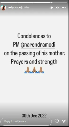 Swara Bhasker also took to her Instagram stories and penned a tribute. “Condolence to PM Narendra Modi on the passing away of his mother. Prayers and strength… (sic)” she wrote along with folded hands emoticon.