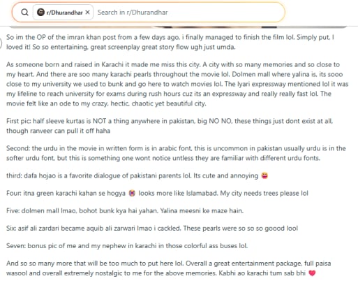 Sharing on Reddit, the fan claimed to have been born and raised in Karachi, how Dhurandhar made him nostalgic. “It [Dhurandhar] made me miss this city,” he shared. Pointing out the local references he spotted in the film, the fan shared meticulous details, including the Urdu font, Karachi pearls, and even moments from his childhood. In his account, he shared, “The Lyari expressway mentioned was my lifeline to reach university for exams during rush hours [sic].”