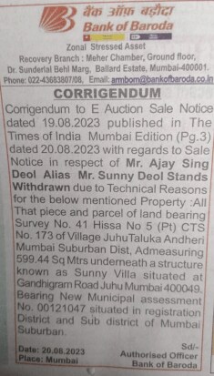 It reads, “Corrigendum to E Auction Sale Notice dated 19.08.2023 published in The Times of India Mumbai Edition (Pg.3) dated 20.08.2023 with regards to Sale Notice in respect of Mr. Ajay Sing Deol Alias Mr. Sunny Deol Stands Withdrawn due to Technical Reasons for the below mentioned Property :All That piece and parcel of land bearing Survey No. 41 Hissa No 5 (Pt) CTS No. 173 of Village Juhu Taluka Andheri Mumbai Suburban Dist, Admeasuring 599.44 Sq Mtrs underneath a structure known as Sunny Villa situated at Gandhigram Road Juhu Mumbai 400049. Bearing New Municipal assessment No. 00121047 situated in registration District and Sub district of Mumbai Suburban.”