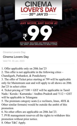 Here’s some good news for the movie buffs as they are in for a treat and will now get to watch films in theatres for just Rs 99 on the occasion of ‘Cinema Lovers Day’.