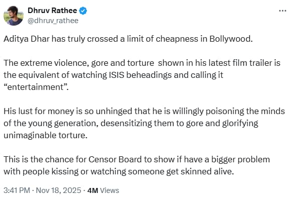 Rathee went on to accuse the team behind Dhurandhar of using violence as a way to attract attention and earn more money. His post further read, “His lust for money is so unhinged that he is willingly poisoning the minds of the young generation, desensitizing them to gore and glorifying unimaginable torture.”
