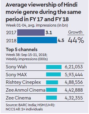 Even as the TV industry is reeling from the macro-level aftermath of demonetisation and GST, the Hindi movie channel space has thrown up a surprise. While ad spends have plummeted across television in FY18 compared to the previous fiscal — by 9.5% in the Hindi GEC genre and 4.2% in the Hindi news genre — the Hindi movie genre has managed to register an increase of 24.5% according to a recent KPMG report.