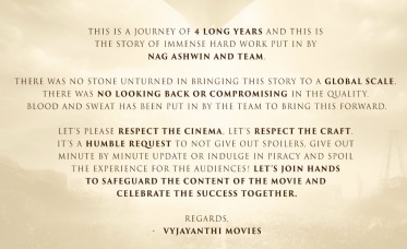 Nag Ashwin’s team urged the audience to avoid giving spoilers. The team took to X and shared the following post requesting people to respect the cinema and the craft.