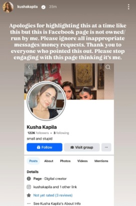 Influencer-actor Kusha Kapila, woke up to several reports on Sunday from fans who complained about receiving “’inappropriate messages” and “money requests” from her Facebook account. She quickly warned her fans about a fake account claiming to be her and asking for money from her followers. She posted a story urging everyone to refrain from interacting with the account and ignoring the messages.