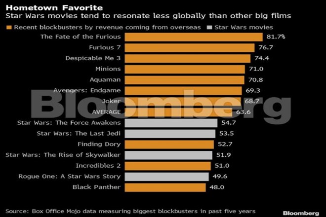 Walt Disney Co.’s “Star Wars: The Rise of Skywalker” passed $1 billion in worldwide ticket sales — thanks in large part to U.S. fans. The picture, released Dec. 20, has taken in roughly half of its ticket sales domestically. That’s unusual in the modern age of global blockbusters: International markets accounted for 73% of the movie businesses’ $42.5 billion in sales globally in 2019, according to Comscore Inc.