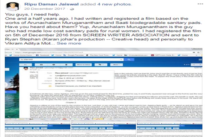 Meanwhile, Ripu Daman had posted about PadMan around two months back on his Facebook account. “One and a half years ago, I had written and registered a film based on the works of Arunachalam Muruganantham and Saati biodegradable sanitary pads. Have you heard about them? Yup, Arunachalam Muruganantham is the guy who had made low cost sanitary pads for rural women. I had registered the film on 5th of December 2016 from SCREEN WRITER ASSOCIATION and sent to Ryan Stephan (Karan johar’s production — Creative head) and personally to Vikram Aditya Motwane. And you know what happened? After ten days on 16th of December 2016, I heard the news that Mrs. Twinkle Khanna revealed that her production is making a film based on his life, starring AKSHAY KUMAR,” read his FaceBook post.