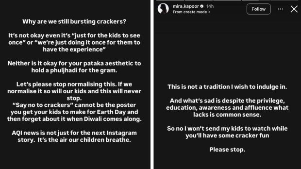 Commonly seen on actors’ social media feeds and influencers posting with a blurry Gen-Z aesthetic and posing with their brightly lit crackers. Kapoor wrote that it was not “okay for your pataka aesthetic to hold a phuljhadi for the gram.” She urged parents and her audience to “stop normalising” bursting crackers as a ritual on Diwali.