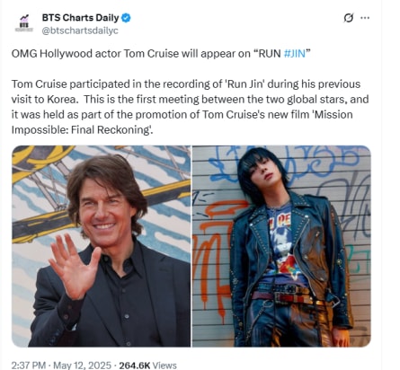 According to a report by Edaily, Cruise is set to appear in a special segment of Run Seok Jin, a light-hearted series where Jin embarks on unique weekly challenges and experiences. The unexpected appearance of Tom Cruise has created major excitement online, merging K-pop and Hollywood cinema in a way no one anticipated. Fans were quick to dub it the ultimate crossover moment.