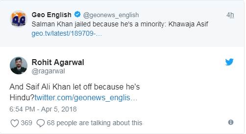 “Maybe if he belonged to the religion of the ruling party of India he would not have been given such a harsh sentence and the court might have been lenient with him,” he claimed. However, the comments made by Asif did not go down well among Twitterers and blasted the Pakistan foreign minister in many humorous tweets. A user asked that actor Saif Ali Khan, who has been acquitted in the blackbuck case, has been let off, since he was a Hindu?
