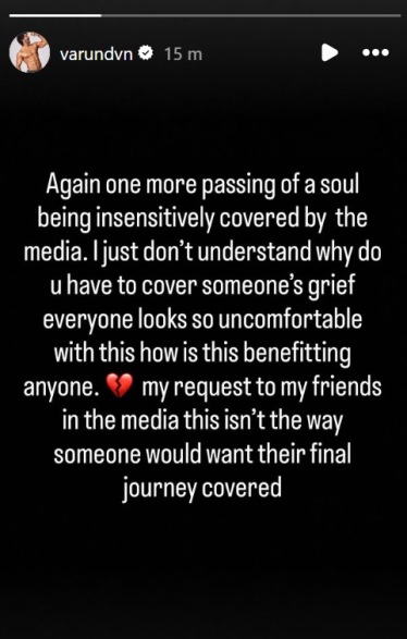 Taking to Instagram Stories, Dhawan addressed photographers and news outlets directly. He wrote, “Again one more passing of a soul being insensitively covered by the media. I just don’t understand why do u have to cover someone’s grief everyone looks so uncomfortable with this how is this benefitting anyone. My request to my friends in the media this isn’t the way someone would want their final journey covered.”