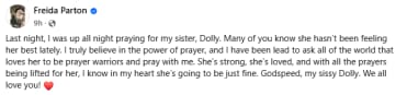 Writing in a Facebook post, Freida shared that he had been up all night “praying for her sister”. She revealed, “Many of you know she hasn’t been feeling her best lately. I truly believe in the power of prayer, and I have been led to ask all of the world that loves her to be prayer warriors and pray with me.” Furthermore, she affirmed that Dolly’s “strong” and “loved”, with “all the prayers being lifted for her.”