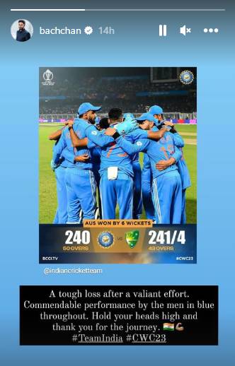 On X, Amitabh Bachchan shared tweets in regard to the Indian team’s talent throughout the tournament. The tweet reads, “T 4836 – …. your talent , capability and standing is beyond all that .. it is supreme .. the results of the 10 you played exhibited that .. you are a feared team .. just see how many ex Champions and Winners you devastated in this WC .. you are the BEST .. and shall remain so .. TeamIndia #RohitSharma.”