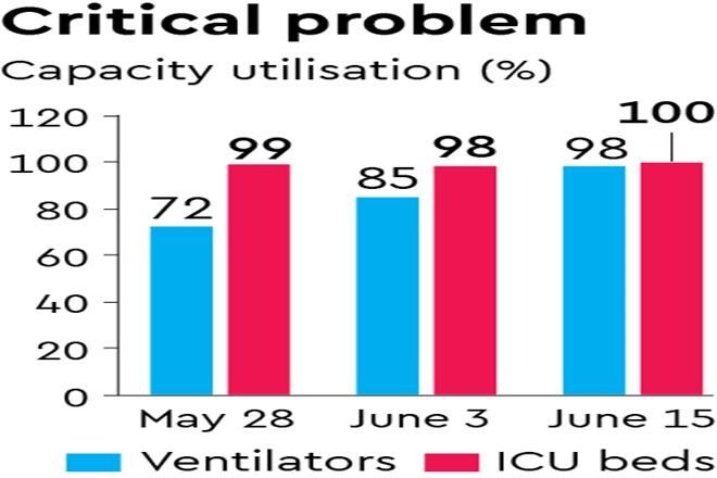 Besides, an analysis of data shows that ventilator and ICU utilisation in the city has been going up since May 28 and the state did little to ready more infrastructure in time. On May 28, 72% of ventilators and 99% of ICU beds were in use. By June 3, 85% and 98% of ventilators and ICU beds were in use; this increased to 98% for ventilators and near 100% for ICU beds on June 15.