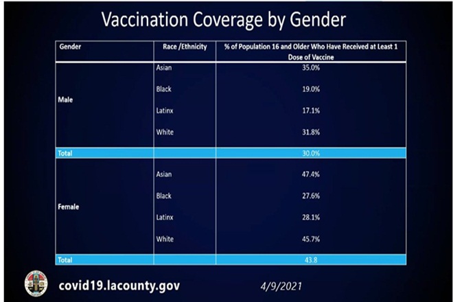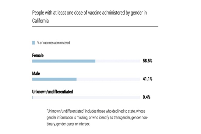 Coming to developed nations like the U.S., the scenario is the opposite and more women are getting vaccinated than men. The gender gap subsists, but in favour of women. As of 3rd May 2021, about 38.5% of the male population had been vaccinated, compared to 43.3% of the female population (Centre for Disease Control and Prevention data). The reasons could be diversifying here, some of the most plausible ones are that women in the U.S. are expected to live about five years more than men, and make up about 55% of the country’s 65+ years population. This group was eligible for their shot earlier than other groups. Women also account for a larger proportion of essential workers, who were also prioritized for vaccination (U.S. Census Bureau). From an economic lens, many men may not afford to take a leave for getting vaccinated and be cautious of a cut in salary, or of losing their jobs if they get sick. Los Angeles is the largest city in California, and both the places show similar trends, with women outnumbering men in the administration of vaccination doses.