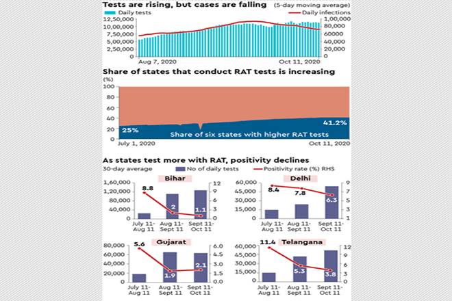 Coronavirus cases in India: On October 11, India recorded 74,383 infections, and the country had conducted 10,78,544 tests. Over the last two weeks, starting September 23, India has been conducting more tests, but the daily infections have been falling. The country’s positivity rate — daily cases upon daily tests — which was once trending at a high of 12.6% on September 7, has come down to 6.9%.