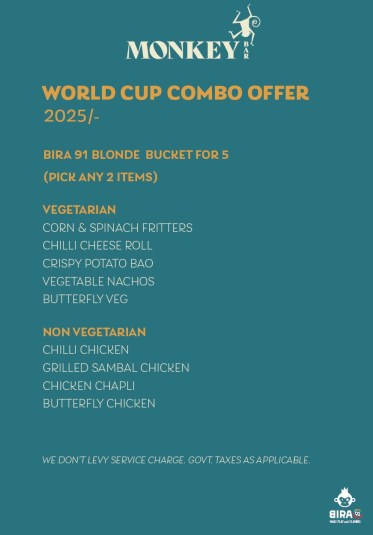 Monkey Bar is turning up the excitement for the upcoming World Cup final with an unmissable offer that promises to transform your viewing experience. Immerse yourself in the thrill of the game with our live screening, creating an electrifying stadium atmosphere right at Monkey Bar. Enjoy the match on a big screen, delivering an unparalleled visual experience that captures every moment of the action. To complement the excitement, indulge in our specially curated food and alcohol combos, ensuring that your taste buds are as satisfied as your football fever. Quench your thirst with our beer buckets, complete with promotional deals that make every sip even more enjoyable. As you cheer for your favorite team, let our skilled face painter add a touch of spirited creativity to your World Cup celebration, turning every match into a memorable event. Monkey Bar is your ultimate destination for the World Cup final, where fun, flavor, and football collide for an unbeatable experience.