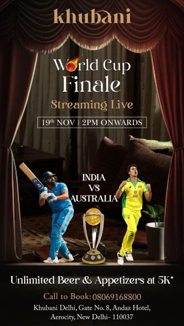 Khubani is gearing up for an unforgettable spectacle as the World Cup Final Match between India and Australia draws near. Get ready for an electrifying atmosphere with Khubani’s exclusive live screening event, featuring not just the thrilling cricket match but an ensemble of entertainment. Picture this: live DJ performances, energetic pom-pom girls, vibrant face painting, and the pulsating beats of dhol, all coming together to create an unparalleled match-day celebration. To add to the excitement, Khubani offers an unbeatable deal—unlimited beer, scrumptious appetizers, and the promise of an enthralling cricket experience—for just 5000 per person. Join us at Khubani for an adrenaline-packed showdown and an evening etched with the spirit of cricket, camaraderie, and unlimited fun!