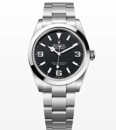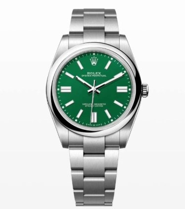 The Rolex Oyster Perpetual is the most affordable entry in the Rolex lineup, known for its simplicity and elegance. This basic three-hand watch lacks a chronograph, rotating bezel, or date window. It epitomizes Rolex’s patented automatic movement, precision, and reliability. Available in sizes from 31mm to 41mm, it features a sunray or lacquered dial and is made of corrosion-resistant Oystersteel.